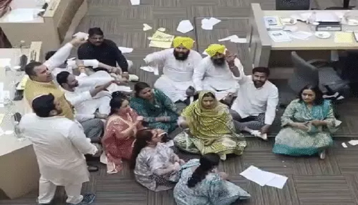 ਕਾਂਗਰਸ ਤੇ ਆਪ ਕੌਂਸਲਰਾਂ ਨੇ ਏਜੰਡੇ ਦੇ ਮਤੇ ਦੀਆਂ ਕਾਪੀਆਂ ਸਦਨ ਵਿਚ ਫਾੜ ਦਿੱਤੀਆਂ । ਕਾਂਗਰਸ ਕੌਂਸਲਰਾਂ ਨੇ ਨਿਗਮ ਮੁਲਾਜ਼ਮਾਂ ਦਾ ਸ਼ੋਸ਼ਣ ਬੰਦ ਕਰੋ ਲਿਖੇ ਪਰਚੇ ਚੁੱਕੇ ਕੇ ਨਾਅਰੇਬਾਜ਼ੀ ਸ਼ੁਰੂ ਕਰ ਦਿੱਤੀ। ਇਸੇ ਦੌਰਾਨ ਉਨ੍ਹਾਂ ਨੇ ਮੀਟਿੰਗ ਦੇ ਏਜੰਡੇ ਦੇ ਪੇਪਰ ਫਾੜ ਕੇ ਮੇਅਰ ਵੱਲ ਸੁੱਟ ਦਿੱਤਾ। ਹੰਗਾਮਾ ਜ਼ਿਆਦਾ ਵਧਣ ‘ਤੇ ਮੇਅਰ ਨੇ 10 ਮਿੰਟ ਲਈ ਮੀਟਿੰਗ ਨੂੰ ਮੁਲਤਵੀ ਕਰ ਦਿੱਤਾ।