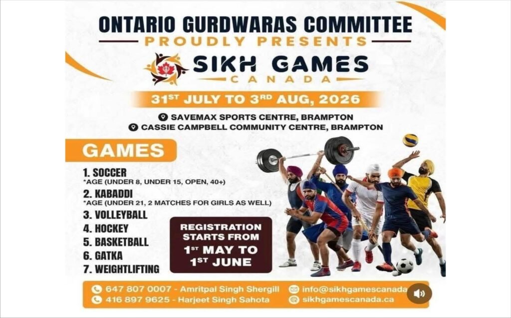 ਟੋਰਾਾਂਟੋ ( ਬਲਜਿੰਦਰ ਸੇਖਾ) ਕੈਨੇਡਾ ਦੇ ਸੂਬੇ ਉਨਟਾਰੀਓ ਦੇ ਇਤਿਹਾਸ ਵਿੱਚ ਪਹਿਲੀ ਵਾਰ ਖਿਡਾਰੀਆਂ ਅਤੇ ਖੇਡਾਂ ਨੂੰ ਉਤਸ਼ਾਹਿਤ ਕਰਨ ਲਈ ਸਿੱਖ ਗੇਮਜ਼ ਹੋਣ ਜਾ ਰਹੀਆਂ ਹਨ। ਇਹ ਖੇਡਾਂ ਪੰਜਾਬੀਆਂ ਦੀ ਸੰਘਣੀ ਵਸੋਂ ਵਾਲੇ ਬਰੈਂਪਟਨ ਸ਼ਹਿਰ ਦੇ ਸੇਵਮੈਕਸ ਸਪੋਰਟਸ ਸੈਂਟਰ ਅਤੇ ਕੈਸੀ ਕੈਂਪਬੈਲ ਕਮਿਊਨਿਟੀ ਸੈਂਟਰ ਚ ਉਨਟਾਰੀਓ ਗੁਰਦੁਆਰਾ ਕਮੇਟੀ ਵੱਲੋਂ ਕਰਵਾਈਆਂ ਜਾਣਗੀਆਂ। ਪੂਰੀ ਜਾਣਕਾਰੀ ਪੋਸਟਰ ਤੇ ਦੇਖ ਸਕਦੇ ਹੋ ।